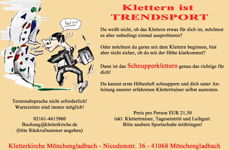 Dann ist das Schnupperklettern genau das richtige für dich! Komm zu uns in die Kletterkirche und probiere es aus.